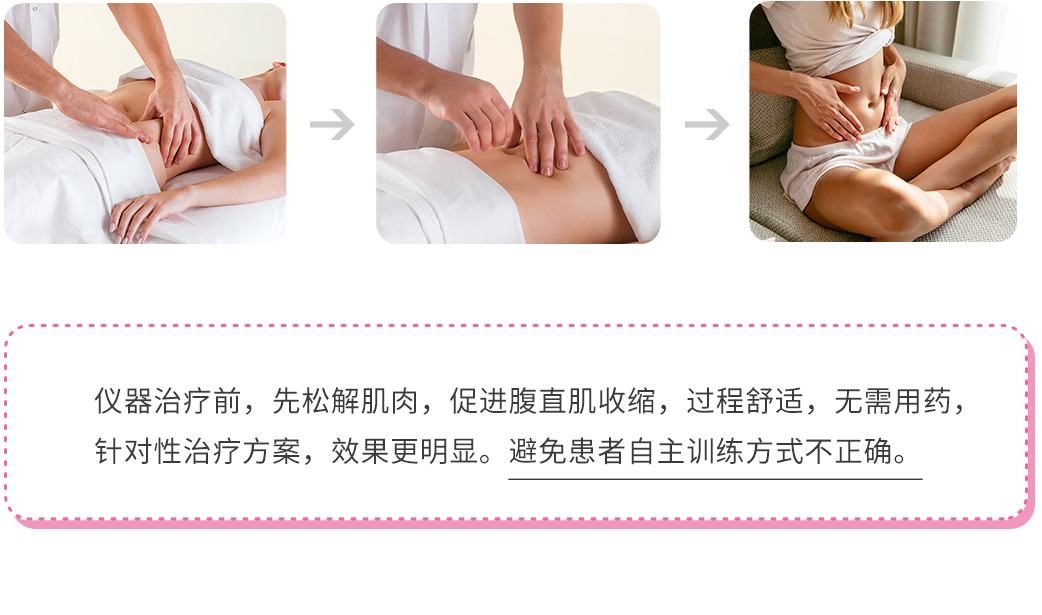 采用生物电刺激反馈治疗,使腹部肌肉被动收缩,激活腹部神经肌肉,增加肌肉纤维的抗疲劳性,对腹部肌群进行强化。